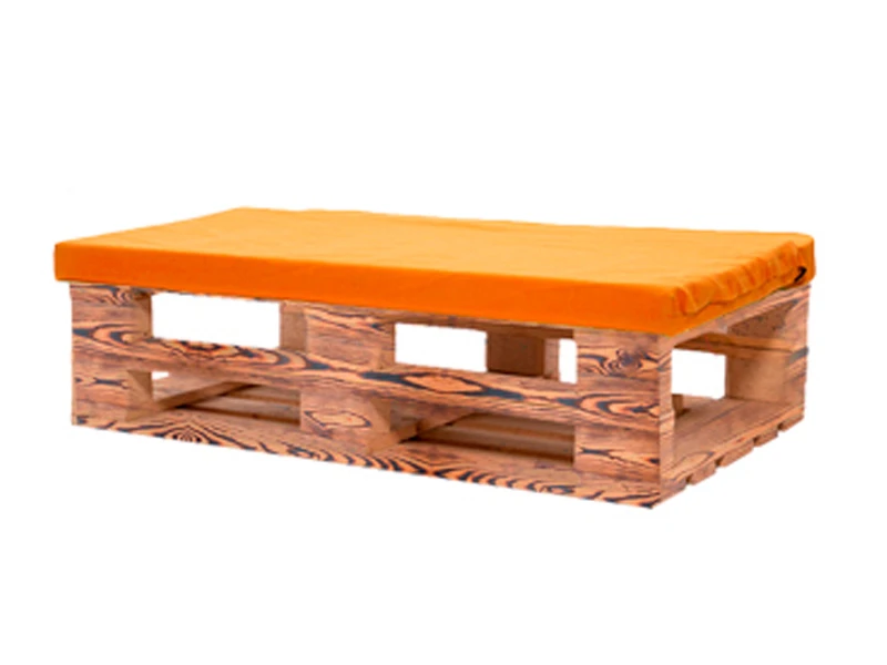 Аренда банкетки из паллет обожжённой с оранжевой подушкой на мероприятие