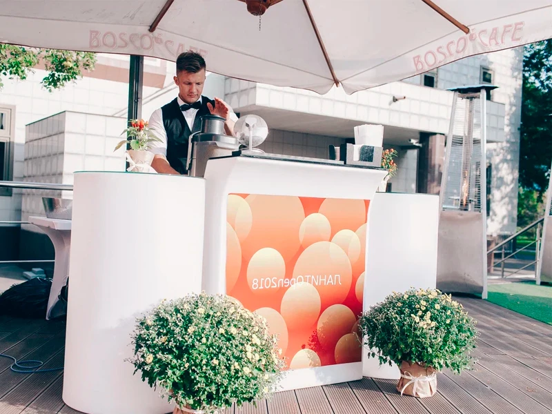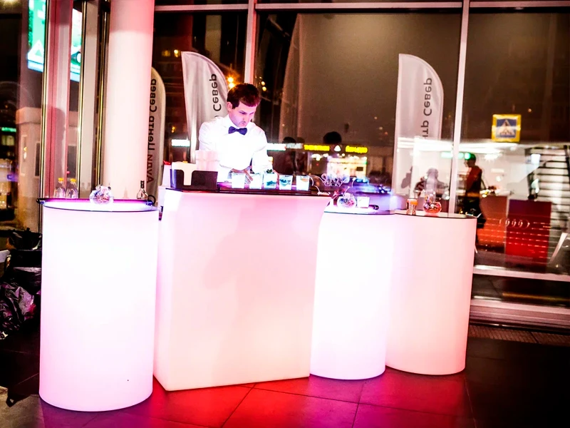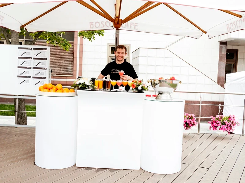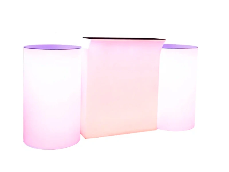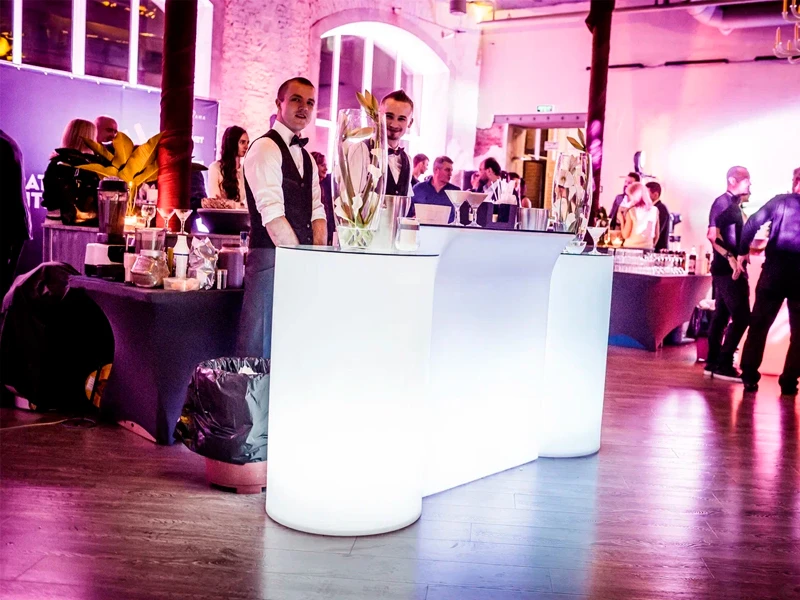 Представляем вашему вниманию элегантный и функциональный комплект, состоящий из изысканной барной стойки и ярких коктейльных столов. Эта модель станет центральным элементом любого интерьера, добавив лоска вашему выездному событию. Главной особенностью конструкции является встроенная в основание LED-подсветка, режим которой можно легко адаптировать под общую цветовую гамму вашего торжества. Данная мебель идеально подходит для оформления входных групп бизнес-центров, просторных площадок в стиле опен-спейс и праздничных залов, создавая комфортную атмосферу для общения гостей.