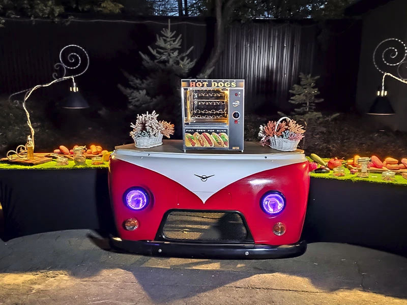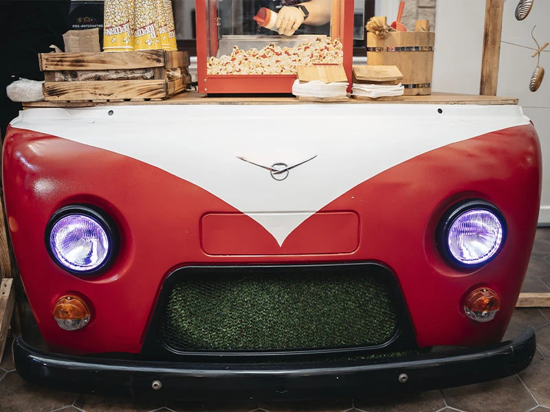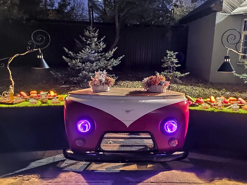 Эксклюзивная мобильная стойка, созданная из фронтальной части легендарного автомобиля, станет центральным элементом оформления любой площадки. Это универсальное решение идеально подходит для размещения станций с закусками, попкорном или хот-догами, а также может служить полноценным рабочим местом для диджея или зоной розлива напитков. Дизайн оборудования гарантированно привлекает внимание гостей, создавая особую атмосферу на тематических вечеринках. Для вечерних программ предусмотрена подсветка — встроенные фары не только дополняют ретро-стиль, но и обеспечивают качественное освещение рабочей зоны.