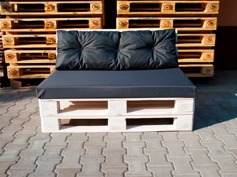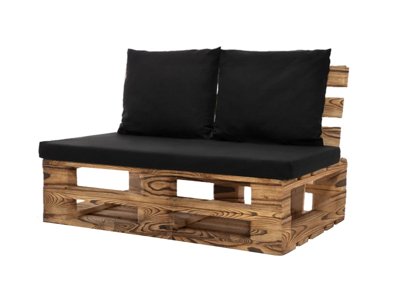 Аренда дивана из обожжённых паллет двухместного с черной подушкой на мероприятие