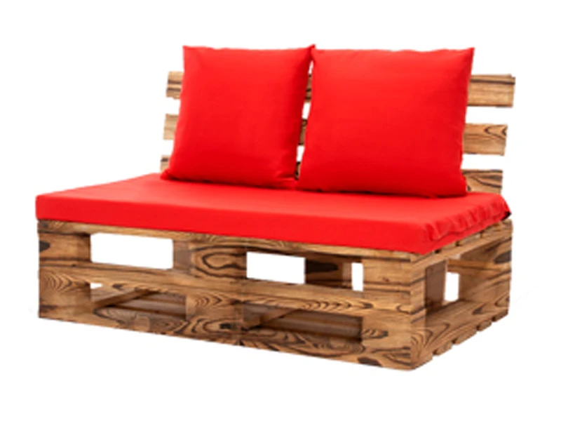 Аренда дивана из обожжённых паллет двухместного с красной подушкой на мероприятие