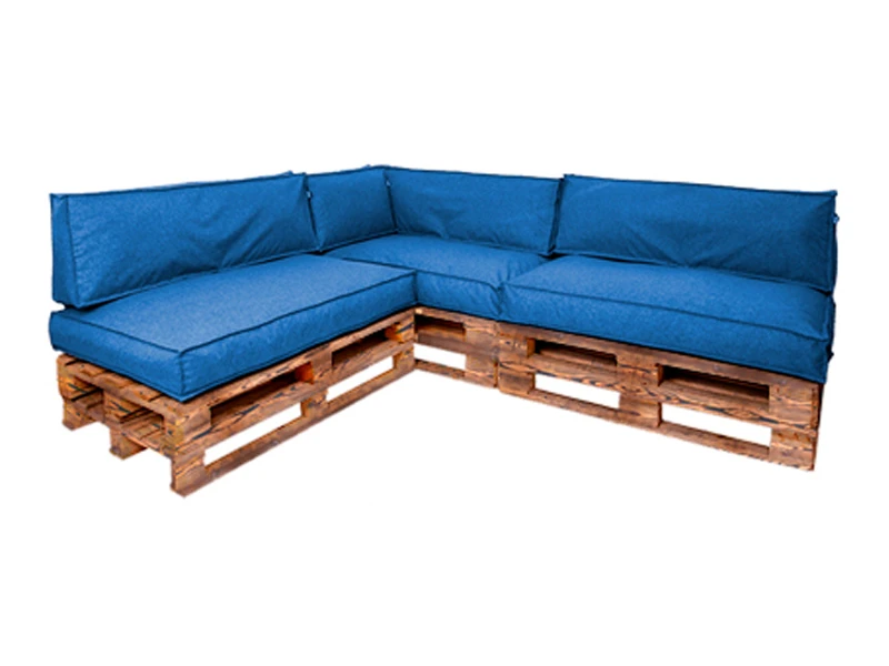 Аренда дивана из обожжённых паллет углового с подушкой синего цвета на мероприятие