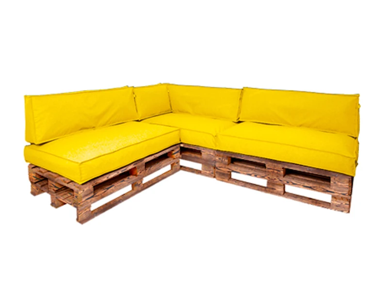 Аренда углового дивана из обожжённых паллет с подушкой желтого цвета на мероприятие