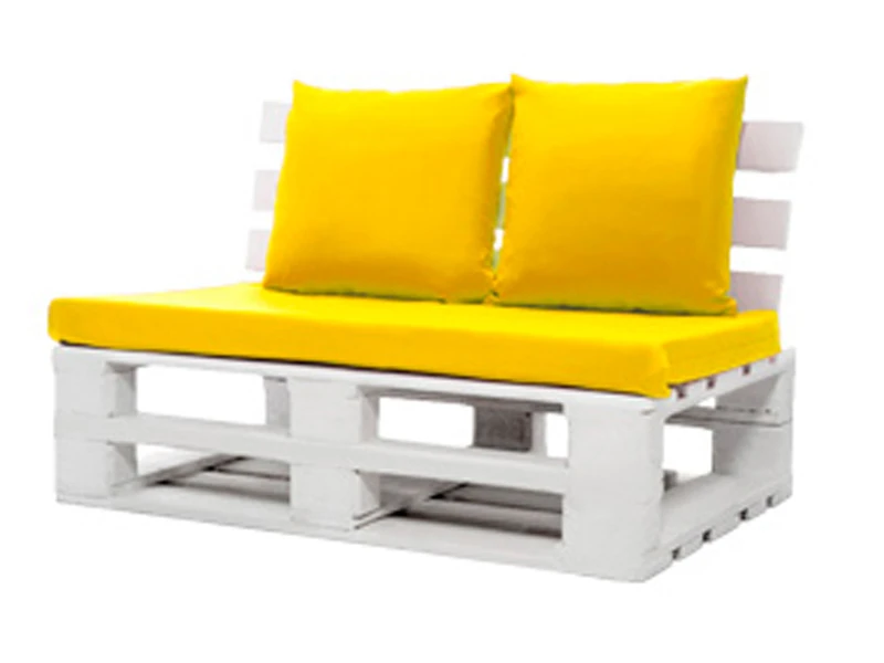 Аренда белого двухместного дивана из паллет с желтой подушкой на мероприятие