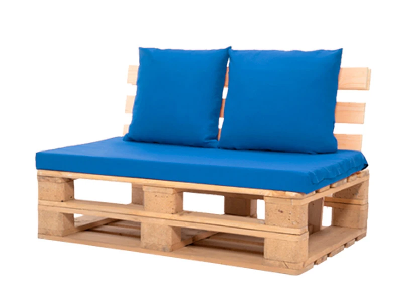 Аренда двухместного дивана из паллет с синей подушкой на мероприятие