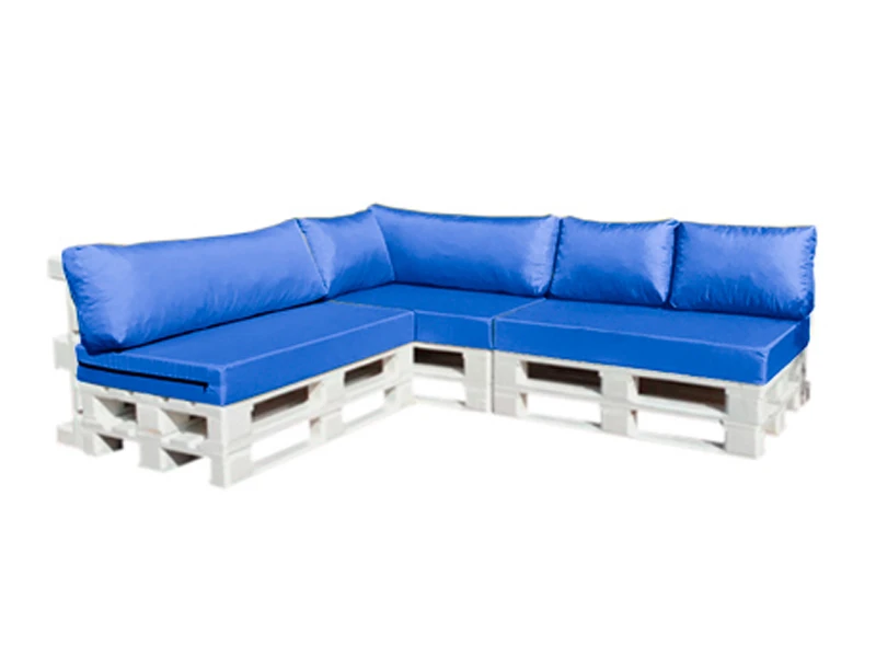Аренда дивана из паллет углового белого с синей подушкой на мероприятие