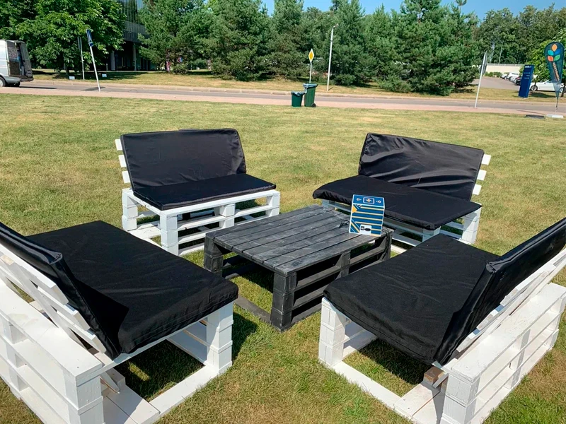 Предлагаем в аренду элегантный двухместный диван из паллет в белоснежном исполнении, дополненный комфортной подушкой благородного серого цвета. Эта модель идеально подходит для создания уютных зон отдыха в стиле лофт или эко на частных и корпоративных событиях. Белый каркас придает мебели легкость и современный вид, а мягкие элементы гарантируют комфорт гостей. Благодаря своей универсальности и компактным габаритам, диван станет отличным функциональным декором для любой площадки, от летней веранды до выставочного павильона.