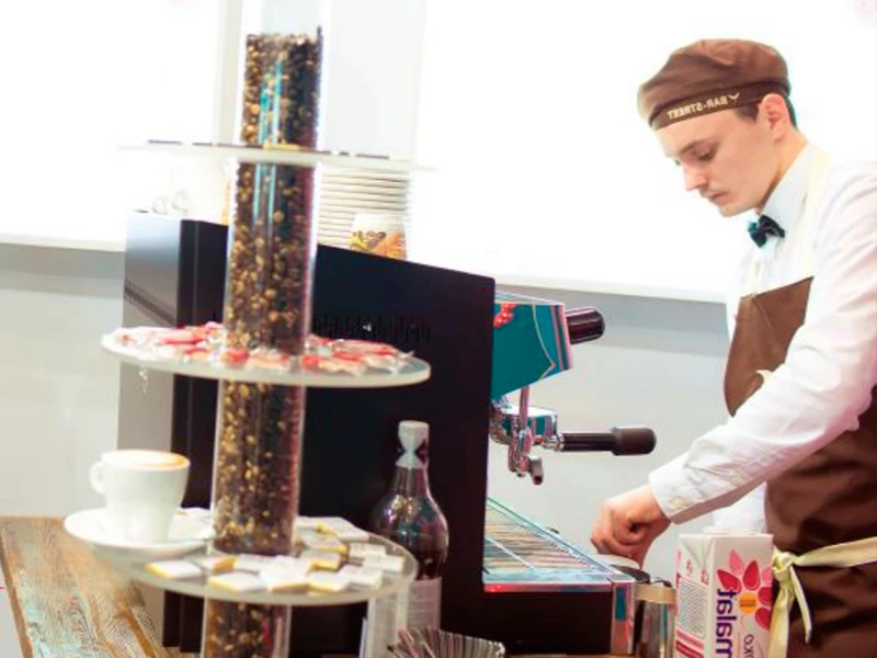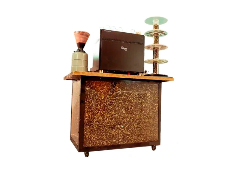 Специализированная кофейная барная стойка — это идеальное решение для организации мобильной кофейни на вашем событии. Конструкция обладает высокой прочностью и устойчивостью, что позволяет безопасно размещать тяжелое профессиональное оборудование. Дизайн фасада, декорированный натуральными кофейными зернами, подчеркивает тематику зоны и придает интерьеру особый шарм. Дополнительным преимуществом является встроенная вращающаяся этажерка в четыре яруса, которая отлично подходит для эффектной презентации пирожных, капкейков или подачи свежесваренных напитков гостям.