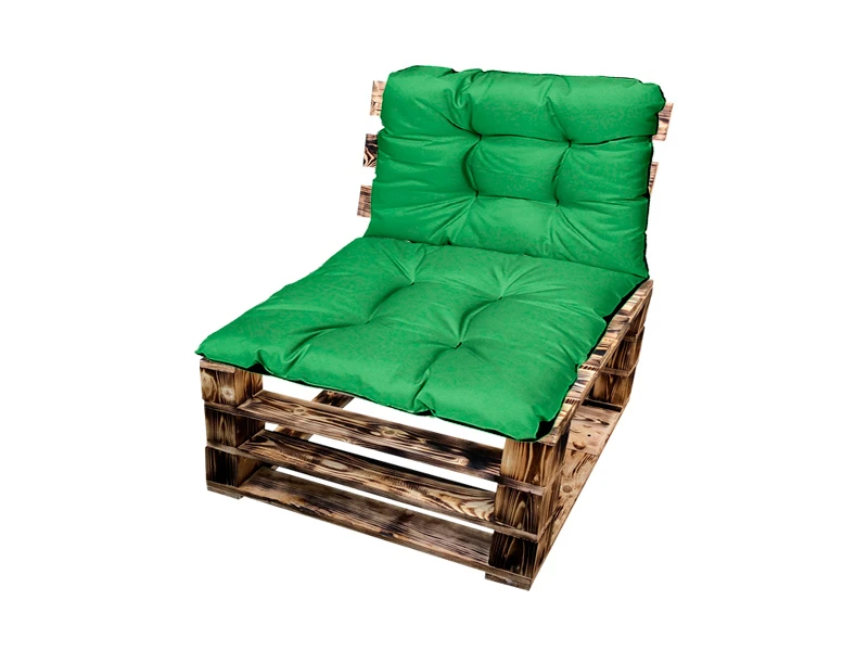 Аренда обожжённого кресла из поддонов с зеленой подушкой на мероприятие
