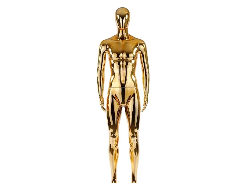 Золотой глянцевый манекен изготовлен из премиального ударопрочного пластика, что гарантирует сохранность его идеальной поверхности даже при интенсивной эксплуатации. Благодаря анатомически точным пропорциям мужской фигуры, эта модель идеально подходит для демонстрации дизайнерских костюмов, верхней одежды и головных уборов. Эффектное золотое покрытие моментально притягивает взгляды посетителей, акцентируя внимание на деталях гардероба и аксессуарах. Использование ростовых фигур в оформлении выставочных стендов или торговых залов позволяет создать премиальную атмосферу, сохраняя при этом фокус на самой коллекции одежды.