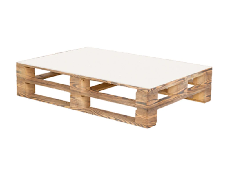 Аренда обожжённого паллетного стола с белой столешницей на мероприятие