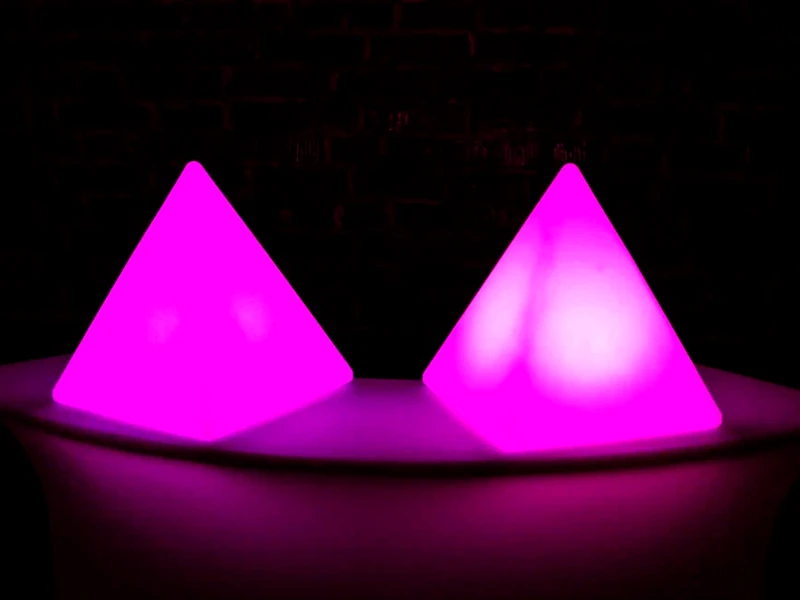 Компактные светящиеся пирамиды представляют собой оригинальное решение для светового дизайна любого пространства. Этот стильный аксессуар мгновенно преображает интерьер, становясь ярким акцентом на вашем событии. Корпус изделия выполнен из прочного износостойкого пластика белого цвета, а внутри установлены современные светодиоды. Встроенный аккумулятор обеспечивает до двенадцати часов непрерывного свечения, что позволяет использовать оборудование на протяжении всего вечера без подключения к сети. Благодаря возможности дистанционного управления, вы можете легко настраивать оттенки и динамические режимы работы, адаптируя освещение под общую концепцию и атмосферу торжества.